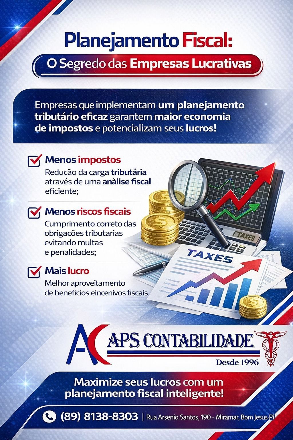 Por que o planejamento fiscal é tão importante? ✔ Redução de impostos: análise do enquadramento tributário ideal e aproveitamento de benefícios fiscais. ✔ Menos riscos fiscais: cumprimento correto das obrigações acessórias e principais. ✔ Mais lucro: diminuição de custos tributários e melhor aproveitamento dos recursos financeiros. Um planejamento bem estruturado permite que o empresário tome decisões com base em dados concretos, garantindo mais segurança e competitividade no mercado. Na APS Contabilidade, oferecemos um planejamento fiscal personalizado, analisando a realidade de cada empresa para identificar a melhor estratégia tributária, sempre com responsabilidade e dentro da legislação vigente.
